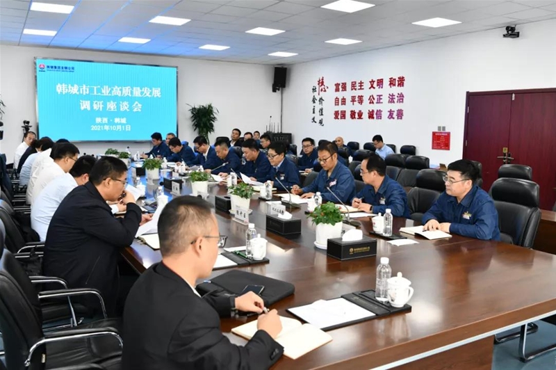 10月1日,國慶節當天,韓城市委書記亢振峰,市委常委、常務副市長張景鋒帶領發改委、工信局、自然資源局、經開區、龍門鎮等部門負責人到公司進行工業高質量發展調研,并召開座談會。公司領導陳驍、劉安民、馮偉、王建軍及相關部門負責同志陪同調研。
