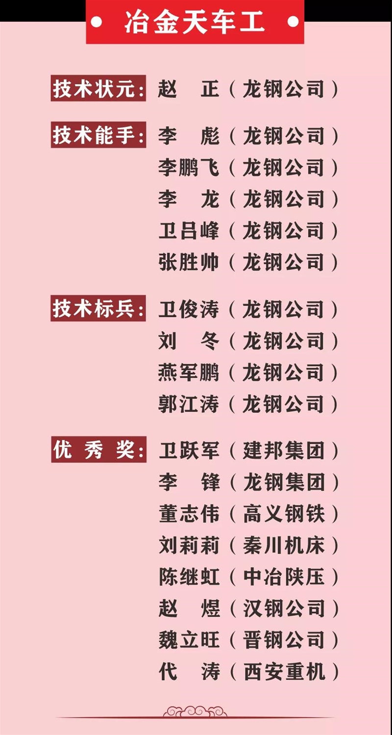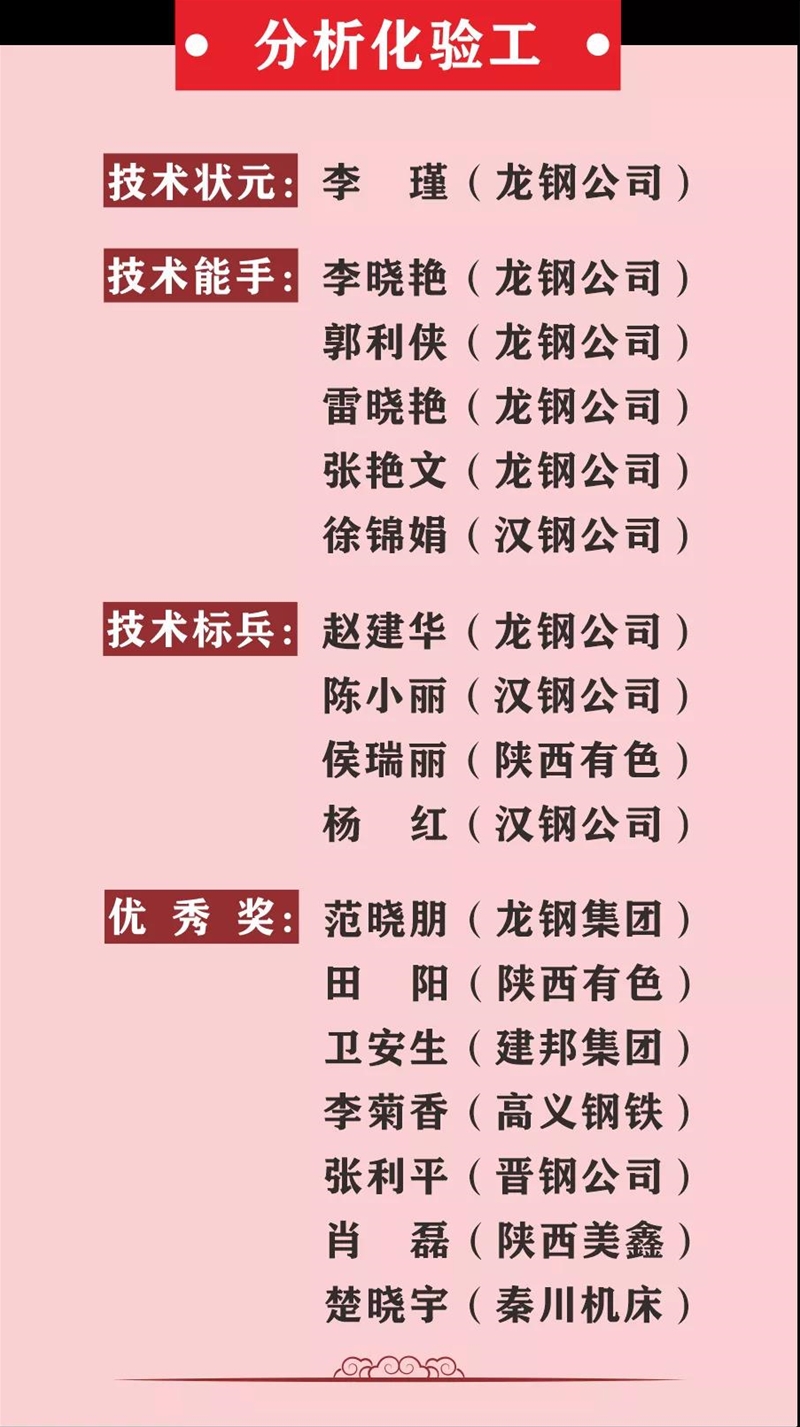 薛繼虎宣布表彰決定。本次競(jìng)賽,來(lái)自陜西省機(jī)械冶金建材系統(tǒng)11家參賽單位以及西北聯(lián)鋼3家山西鋼鐵企業(yè)的137名參賽選手,經(jīng)過(guò)3天的激烈角逐,最終在高爐煉鐵工、冶金天車工、分析化驗(yàn)工、維修鉗工4個(gè)工種競(jìng)賽中產(chǎn)生了陜西省機(jī)冶建材系統(tǒng)“技術(shù)狀元”4名、“技術(shù)能手”20名、 “技術(shù)標(biāo)兵”16名,其中分析化驗(yàn)工和冶金天車工兩個(gè)工種競(jìng)賽還產(chǎn)生了“優(yōu)秀獎(jiǎng)”15名,并在閉幕式進(jìn)行表彰頒獎(jiǎng),還表彰了優(yōu)秀組織單位和優(yōu)秀組織個(gè)人。對(duì)獲得本次大賽高爐煉鐵工、冶金天車工前3名的選手將由組委會(huì)推薦省有關(guān)單位授予“陜西省技術(shù)能手”稱號(hào)。