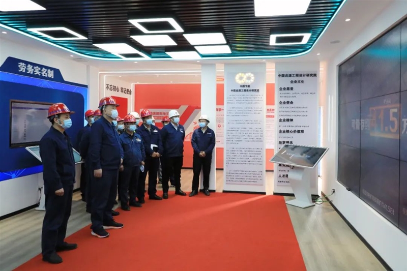 陳驍首先參觀了施工單位智慧建造科技體驗館,觀看了機械化綜合一次料場項目整體設計視頻,對于施工單位黨建管理及數字化進駐施工現場的做法給予肯定。