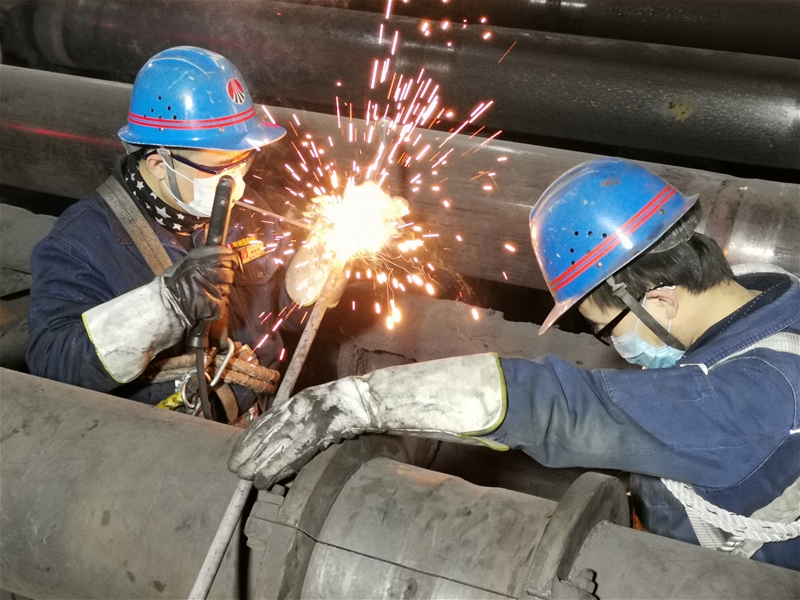 平臺上,幾名中包工正對噴淋管進行改造,焊槍發出的“滋滋”聲與天車的鳴笛聲、人員的討論聲交織在一起,演奏出寒冬里最動聽的音符。
