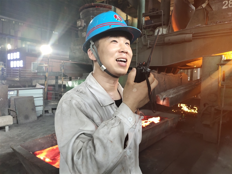 圖十四:煉鋼廠轉爐作業區6#轉爐爐前工倪少學、吳江海面對1600℃的“火焰山”,他們毫不畏懼,將筆直的測溫槍狠狠地插進咆哮的鋼水中,在他們心中,生產所需,便是職責所在!