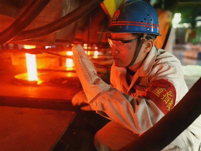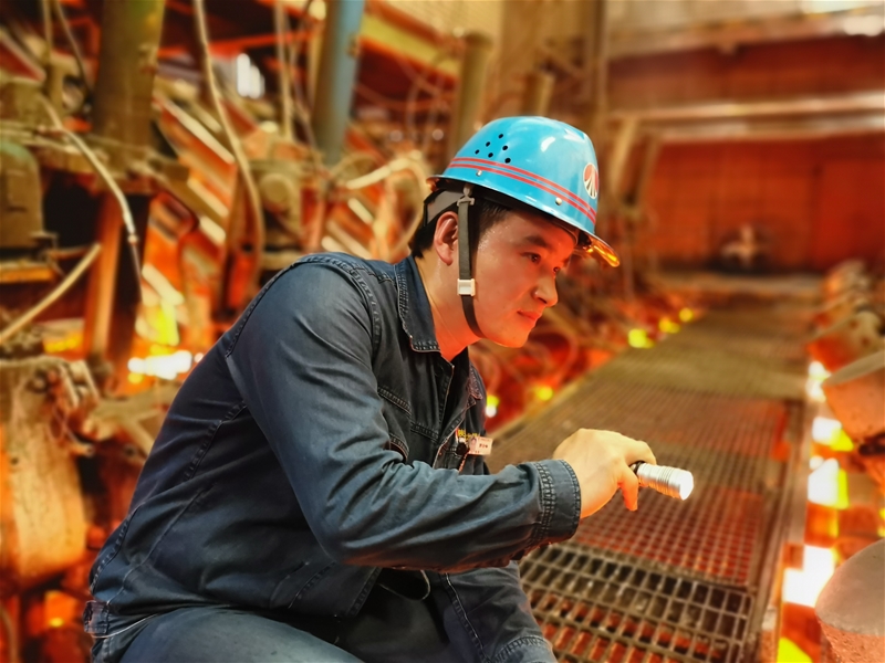 圖八:煉鋼廠連二作業區6#連鑄機中包工何武濤正在對在線水口、機件進行檢查。面對眼前1500℃的鋼水,他眼戴護目鏡,身穿阻燃服,在汗流浹背中守護著安全生產。