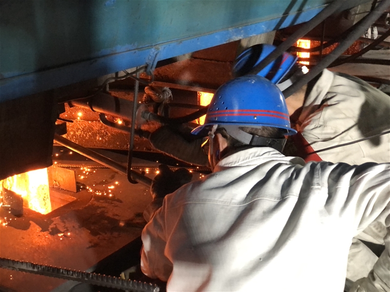 圖二:煉鋼廠連二作業區安檢員郭云峰正在對拉矯系統進行檢查,火紅的鋼坯從他的腳邊緩緩穿過,盡管他全身被烤得微疼,但他的眼睛始終聚焦在運轉的設備上,不敢有一絲懈怠。