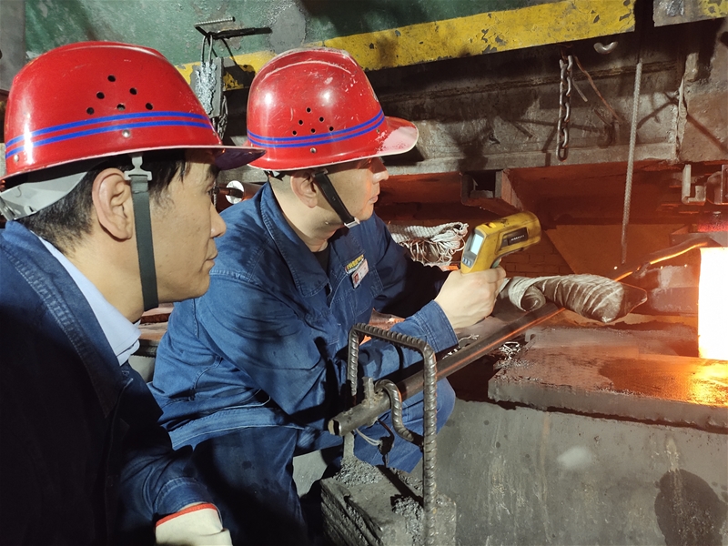 圖十一:煉鋼廠連一作業區作業長雷會林與副作業長李斌正在進行包壁測溫,他們目不轉睛地觀察著中包的運行情況,眼前的鋼水磨練著他們的堅強意志,只為了確保員工安全和生產順行。