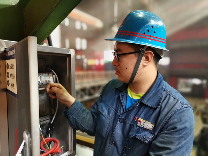 圖四:煉鋼廠轉爐平臺上電儀作業區電工李磊正在對配電柜線路進行檢查,滾滾熱浪撲面而來,他身上的汗腺像被擰開了的開關,瞬間汗如泉涌。