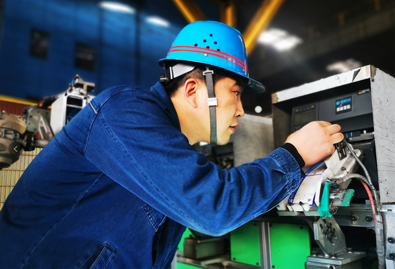 在棒材一線,質(zhì)檢工王志剛正在認真排查標(biāo)牌機器人線路故障,確認故障排除后,準(zhǔn)備啟動機器,開始新一輪的標(biāo)牌打印工作,為生產(chǎn)順行保駕護航。