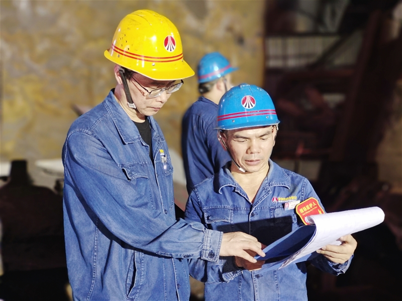 針對生產(chǎn)過程中鐵水罐結(jié)蓋嚴重這一情況,混鐵爐工指揮天車進行鐵錐壓蓋操作,一次鐵錐壓蓋雖然只有短短的幾分鐘,但必須“一快二穩(wěn)三準”,并且不能影響轉(zhuǎn)爐兌鐵,絲毫不能有差錯。混鐵爐工沒有任何抱怨和懈怠,他們一絲不茍地作業(yè),作業(yè)過程艱難而有序。雖然時值秋季,爐臺上依舊火熱,一個班下來,他們的工服始終是濕的,背上沾滿了鐵屑,汗水像斷了線的珠子,順著臉頰滾落。而他們顧不上這些,只緊緊盯著每一罐鐵水,克難攻堅,與時間賽跑、與炙熱戰(zhàn)斗,確保高質(zhì)量完成保供任務(wù)。