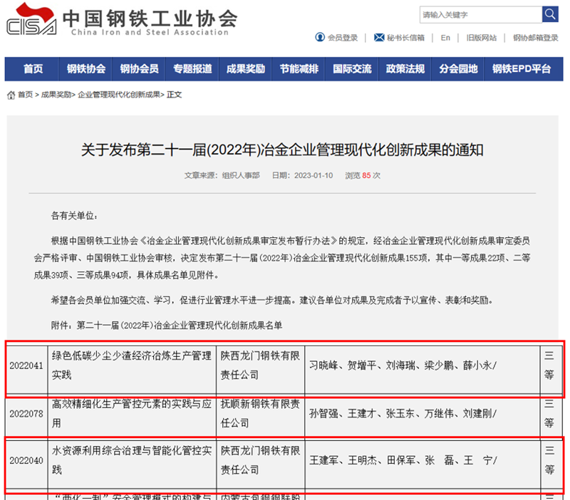 近日,從中國鋼鐵工業協會傳來喜訊,在第二十一屆(2022年)冶金企業管理現代化創新成果評選中,公司《綠色低碳少塵少渣經濟冶煉生產管理實踐》《水資源利用綜合治理與智能化管控實踐》兩個項目榮獲冶金企業管理現代化創新成果三等獎。