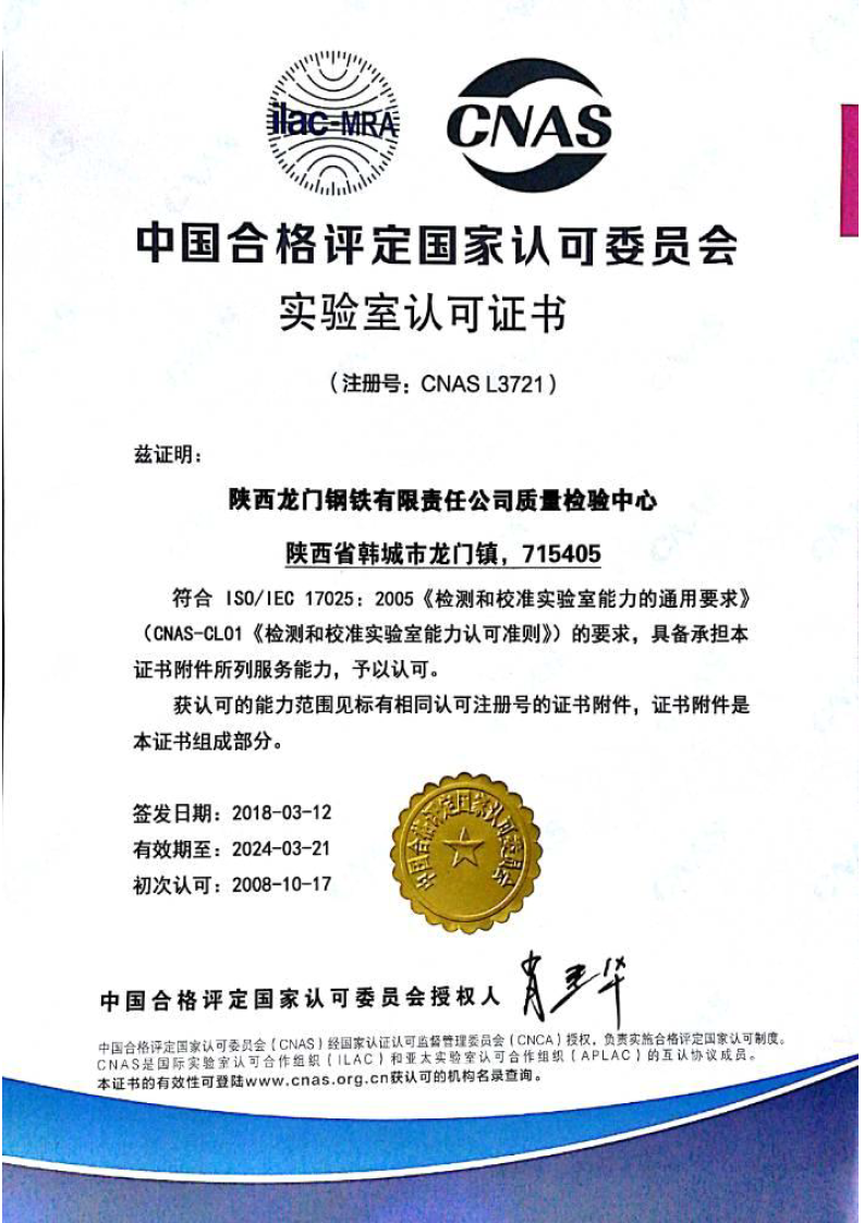 龍鋼公司能源檢計量中心質量檢驗中心擁有進口X-熒光儀、真空直讀光譜儀、紅外碳硫儀、全自動工業分析儀、熱反應測定儀、煤質巖相儀、電液伺服萬能試驗機、鋼筋彎曲和反彎試驗機、維氏硬度計、金相顯微鏡、掃描電鏡、氧氮氫儀等質量控制檢驗檢測設備,整體裝備水平處于國內領先地位。2008年,公司質量檢驗中心獲得國家實驗室認可證書,并連年通過國家認可審核及標準能力檢測驗證。