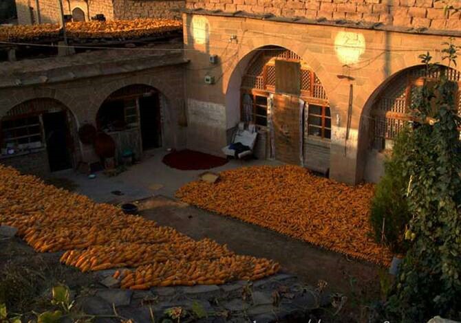 冬日的陜北,山脈連綿寂寥,可裊裊炊煙卻為這廣闊天地添了幾分色彩。天還麻麻亮的時候,陜北的婆姨就開始忙了,堿坂上的碾轱轆悠哉悠哉的轉(zhuǎn)著。拉碾子的驢走走停停,時而偷吃一嘴玉米面,婆姨罵罵咧咧道:“你這個老家禽,給你喂時你不餡,正讓你干活你就餡歡了,噔俅。”跟著母親的孩子,懷中抱著柴草,燃燒在磨盤旁邊,給母親足夠的亮光。“日上三竿”,人們才懶洋洋的出了窯洞,太陽暖烘烘的照到堿坂上那幾根椽上時,那里就開始熱鬧了。吃過飯的人們來到這里,圪蹴在椽上曬太陽,偶爾有一兩家飯做得遲的,會端上美美一老碗黃米撈飯,來趕個場,也圪蹴下問旁邊的人:“你們吃蘭嚒?沒吃家里多得是,可道我家舀去。”眾人發(fā)出:“你就不會把盆端出來?小氣死啦、光顧你一個人吃哩、端一碗夠誰吃?你也太不實在了……”端飯的人嘿嘿一笑,嘶溜嘶溜的吃起自己的飯。